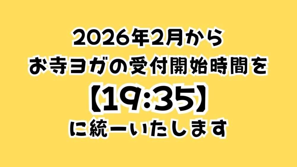 告知2026.01.09【お寺ヨガの受付開始時間のご案内】 ポスト シェア 送る 2026年2月からお寺ヨガの受付は 19:35からとさせていただきます。 準備の関係で、お待ちいただく場合がございますが、お時間になりましたら順次ご案内いたします。 どうぞご理解・ご協力をお願いいたします。ヨガ講師 角畠あさみ